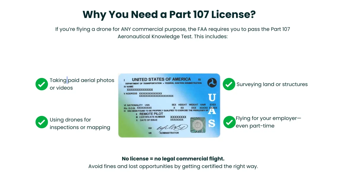Once you pass the FAA exam, you’ll receive your Remote Pilot Certificate and can legally fly for commercial purposes. We also offer continuing education, business guidance, and hands-on training to help you launch your drone career or side hustle.